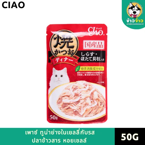 CIAO เพ้าซ์ อาหารเปียกสำหรับแมวโต ทูน่าย่างในเยลลี่กับรสปลาข้าวสาร หอยเชลล์ 50 กรัม