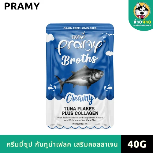 Pramy Broths พรามี่ อาหารเปียกแมวซุปครีม ทูน่าเฟลค เสริมคอลลาเจน 40 G