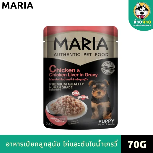 Maria Premium Dog Pouch (มาเรีย อาหารเปียกสุนัข ไก่กับตับในเกรวี่ สำหรับลูกสุนัข) เป็นอาหารเปียกสุนัขเกรดพรีเมียม ที่คัดสรรวัตถุดิบคุณภาพเพื่อสุนัข
