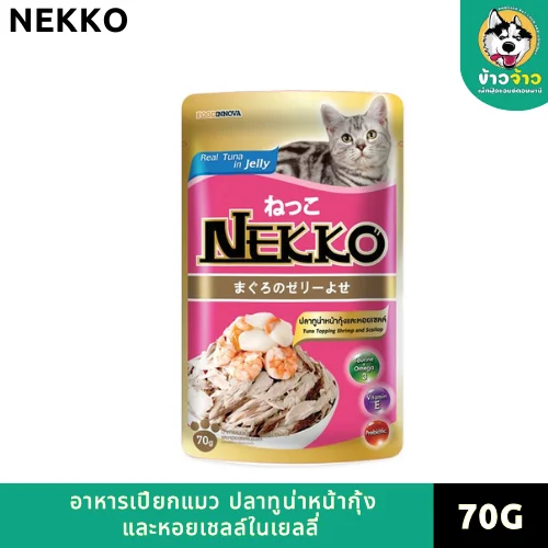 Nekko เน็กโกะ อาหารเปียกแมว รสปลาทูน่าหน้ากุ้งและหอยเชลล์ในเยลลี่ สำหรับแมวโต 70G.
